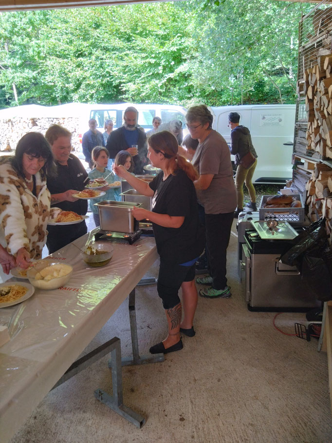 Im Anschluss an das Apéro lud Daniel Friedli alle Anwesenden zum Mittagessen ein. Etwas mehr als 50 Personen trafen sich beim Forstwerkhof zum Spaghetti-Essen und gemütlichen Beisammensein. So verging die Zeit wie im Fluge und nach dem Dessert löste sich die Gruppe nach und nach auf.