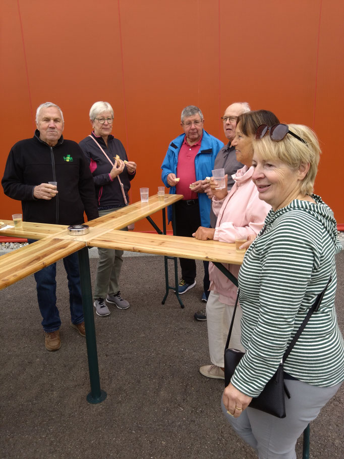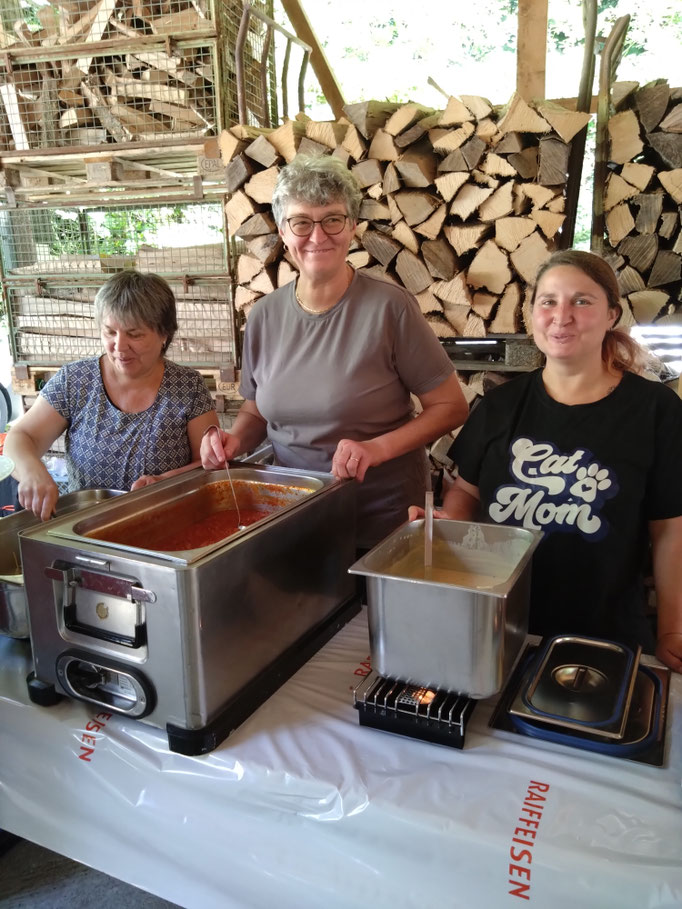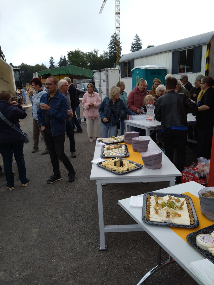 Nach dem Rundgang kamen die Besucherinnen und Besucher in den Genuss eines schmackhaften Produkte-Apéros. Verschiedene Käse-Sorten und frisches Brot luden zum Degustieren ein. Leider fühlten sich auch Wespen vom Geruch der Speisen angezogen, so dass es nicht ganz einfach war, die Plagegeister auf Abstand zu halten.